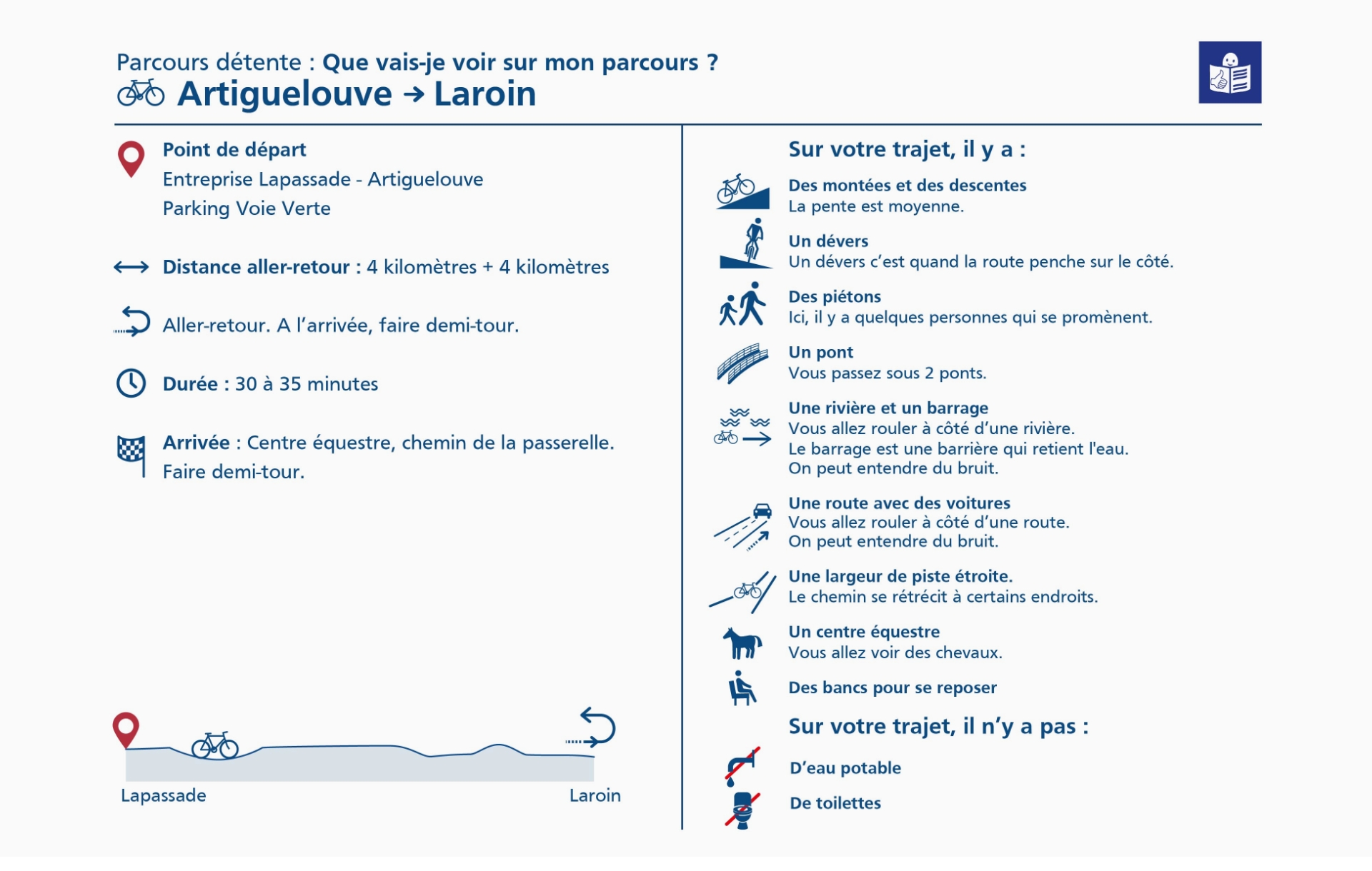 L’ensemble des parcours est peu pentu. La difficulté relevée est donc essentiellement due à la longueur du parcours. Ainsi, 3 types d’itinéraires sont possibles : courts, moyens ou longs. Chacun est symbolisé par des pictogrammes vélo allant de 1 à 3.